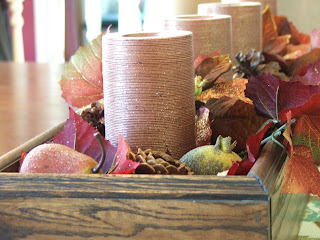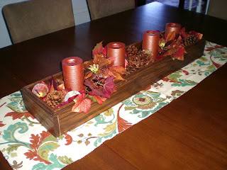 Here is an idea that is really great for a dining table that is long—also great because people can still chat and see each other over the arrangement. I made this “boat” is what we call it—but it really just a long wood container. No clue where “boat” came from—but it stuck somehow—so that is what we call it. It is about 32 inches long and 6 inches wide. It is perfect for anytime of year—but I stained ours walnut to match the fall colors in our house.