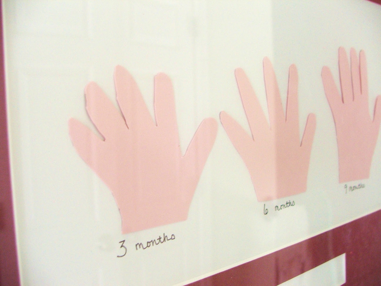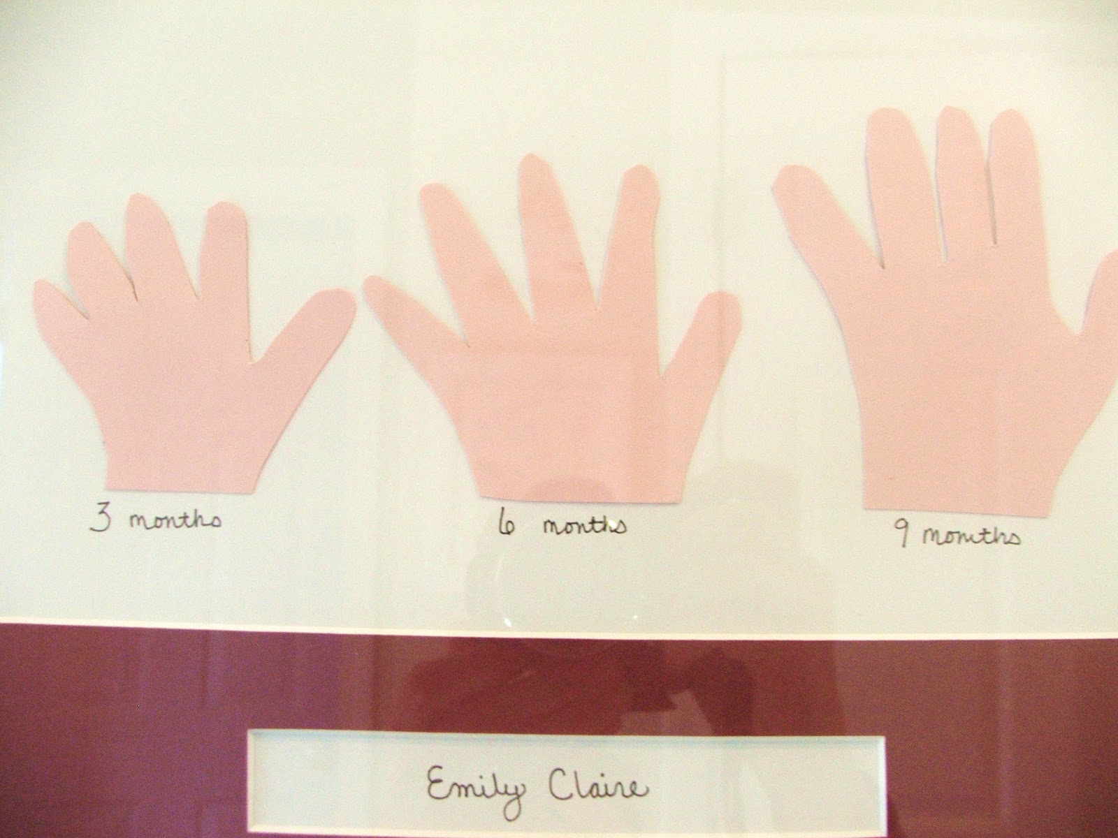 Take some card stock, color of your choice. Trace their little chubby hand, and on the back write the age so you don’t forget. I had one from 3 months, 6 months and 9 months. The 3 month one cracks me up—his hand was so little and chubby it was hard to trace! I then mounted them on a white piece of card stock and wrote (in my very best handwriting of course) how old they were. I had the mat cut at Michael’s because I wanted a little cut out to write their name. Then I framed them. I treasure these little hands—especially because now I don’t get to hold them quite as much ;)