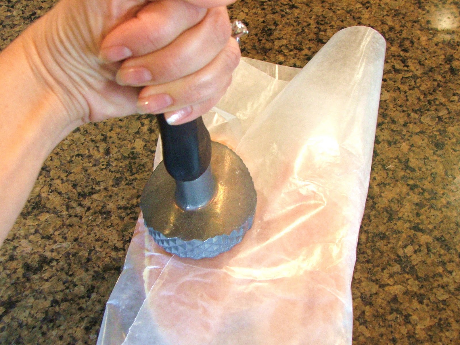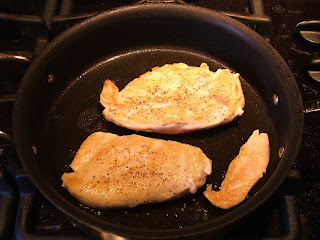 Get your chicken breast. Place on wax paper (if you want to, just makes clean up easier) and pound just a bit. Just so they are uniform in size–they will cook evenly that way. Dry the chicken with a paper towel and sprinkle with salt and pepper.