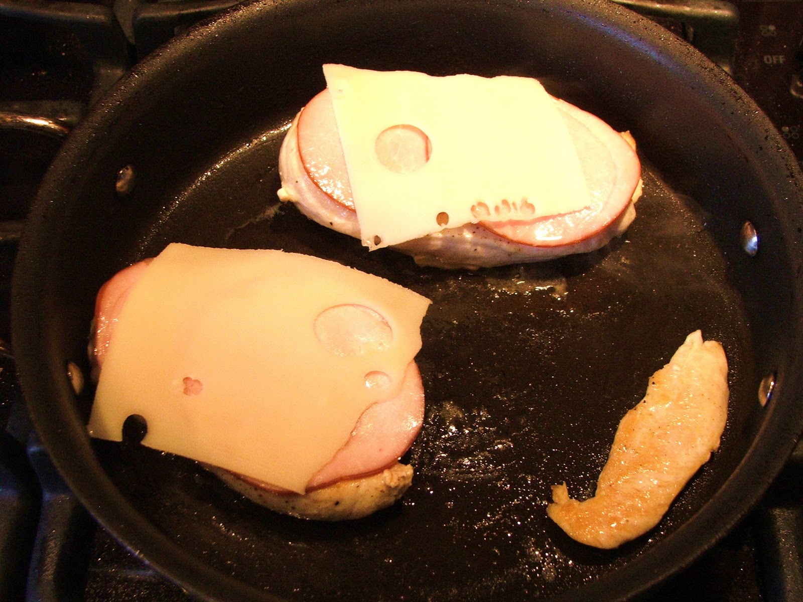 Chicken should be close to done. Place 2 slices of ham and 2 slices of swiss cheese on each piece of chicken. Heat should be med/low. Cover and let melt (3 minutes or so)
