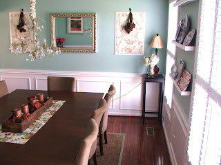 I love how clean and organized your dining room looks. The platters look amazing on the wall and they help to give the room some "POP". What color did you paint the walls, it is such a relaxing color!