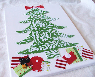 I then cut out some other fabric scraps that I thought would make cute “presents” under the tree. Using Mod Podge..glue all pieces onto the canvas. Using a sponge brush–go over the entire canvas (will dry clear). Let it dry and put on another coat. I like to do 3 coats. It will last forever ;) What do you think?!?!