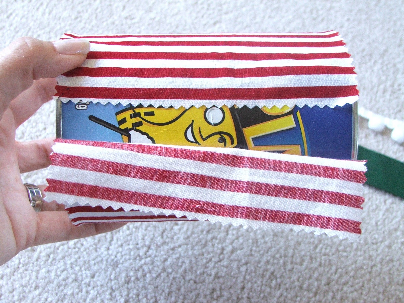 With a little dab of hot glue…secure your ribbon on the center of the can.
