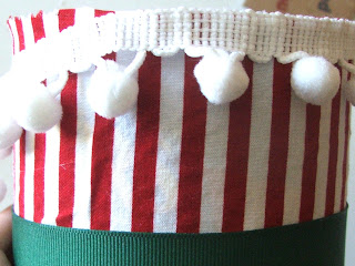 Also with a little hot glue…secure your little pompom trim on the top. I also printed a label on my computer and cut it with pinking shears. Placed it on the front of the ribbon.