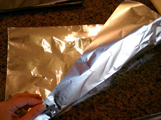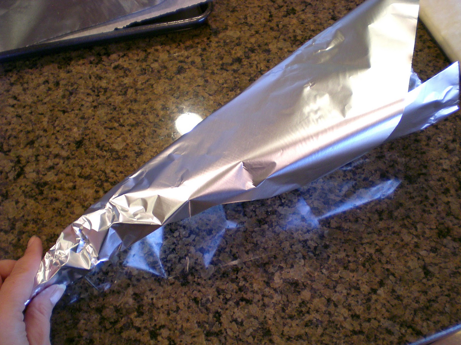 Cut a sheet of foil about as large as a cookie sheet. Roll up gently from the corner forming a cone.
