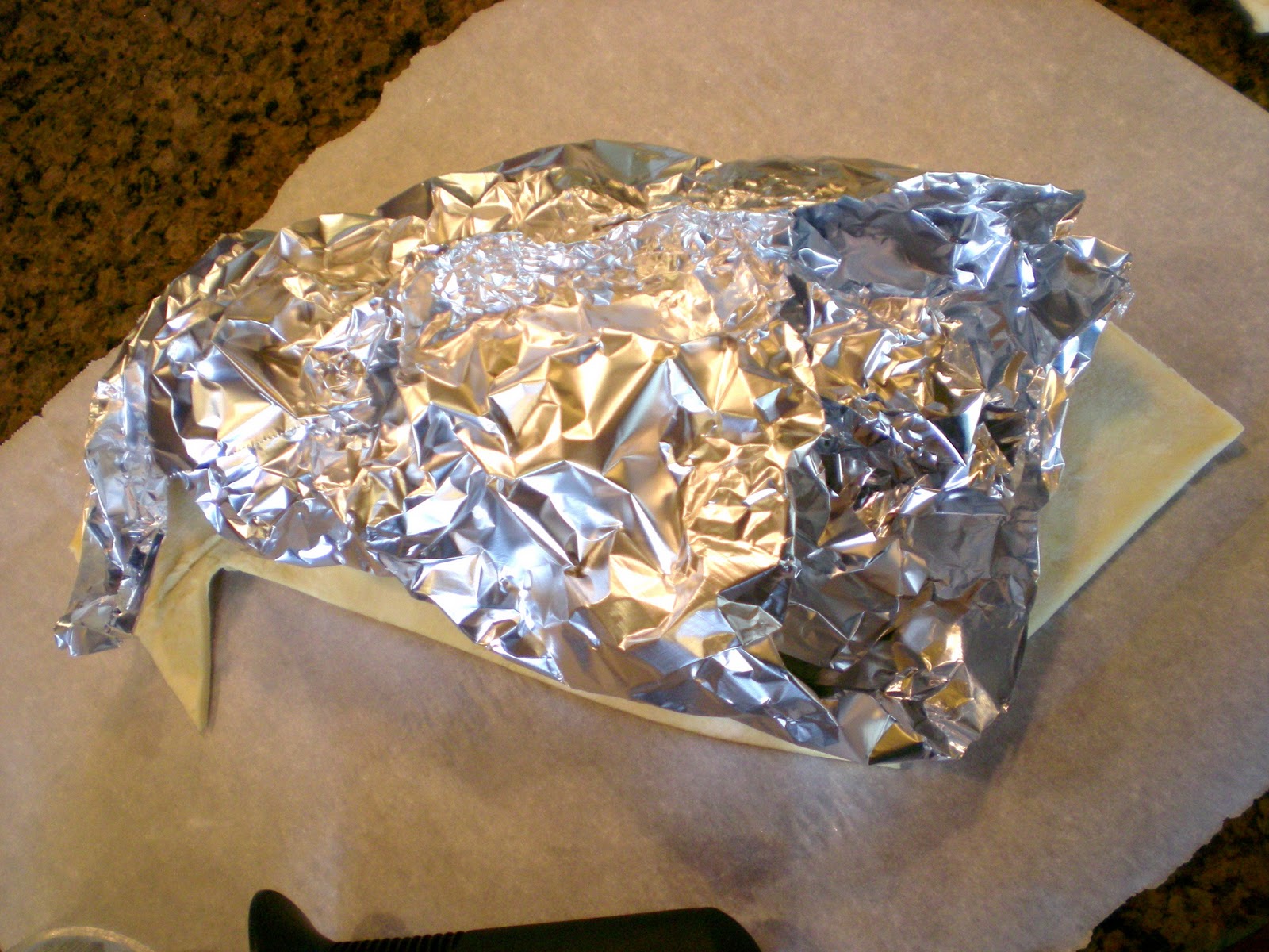 Keep layering all the way up. If you run out before you get to the end of your foil it is ok….after you bake it and it cools you take the foil out so no one will know!