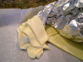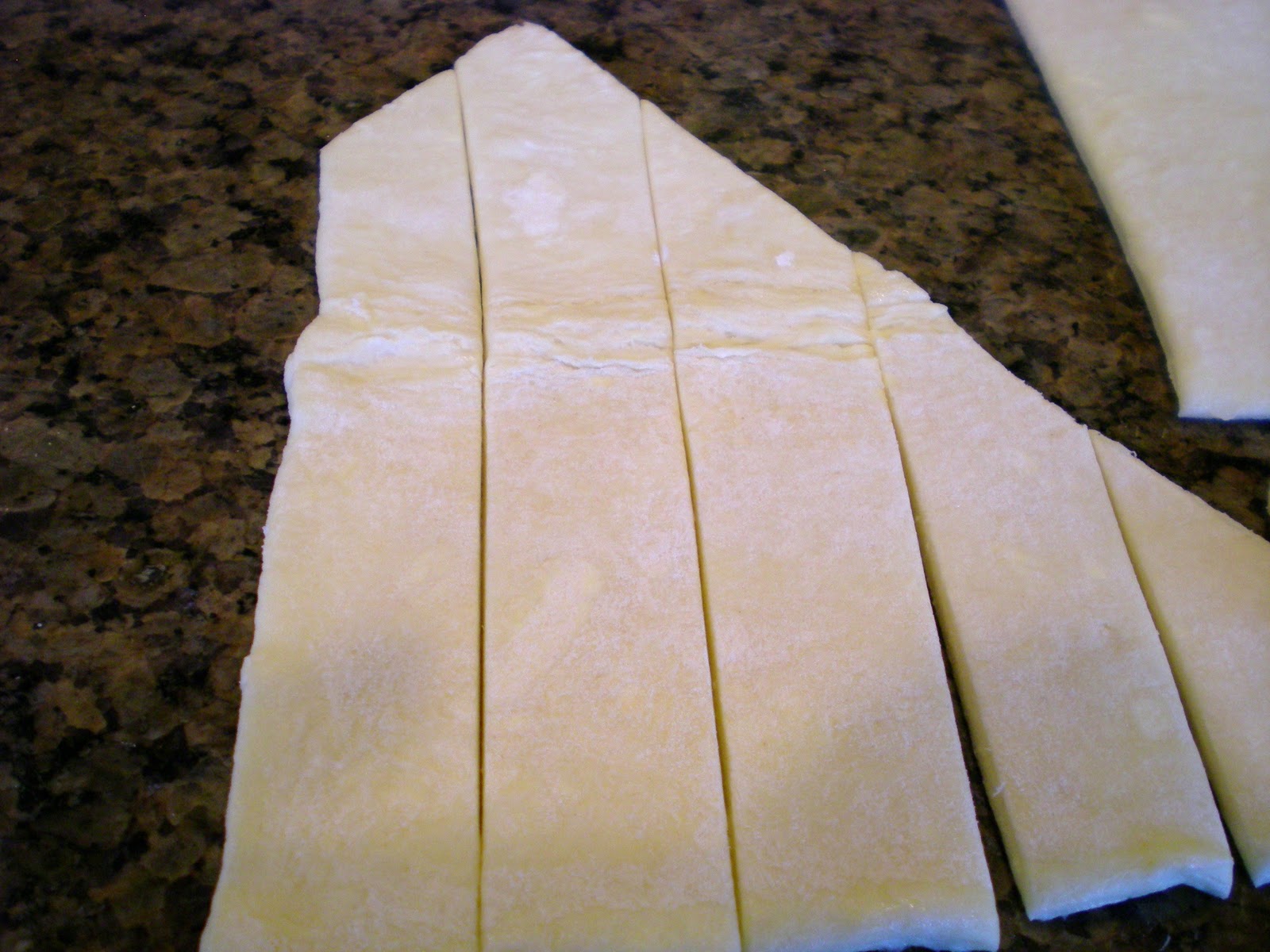 Begin layering the strips at the small end, pinching the ends to the bottom pastry piece.