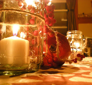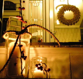Outside, she lined the walkway to the door with large hurricanes and mason jars wrapped with berries from her trees and jute roping. Loved this!!! And so thrifty!