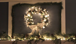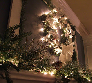 I placed one strand of white lights on the mantle. I covered it with live clippings off the tree. I covered that with one fake garland that has a little sparkle to it…and some pine cones.