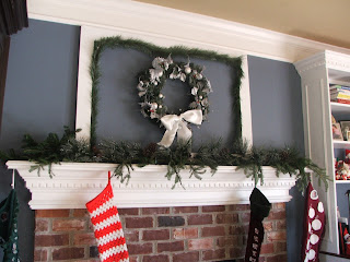 I made a large frame and painted it white (post coming soon on that…) and I stapled pine garland to the inside edge. The wreath is lite with white lights. I also added one garland that has silver leaves on it. Along with a few silver ornaments. A large satin bow finishes the wreath!