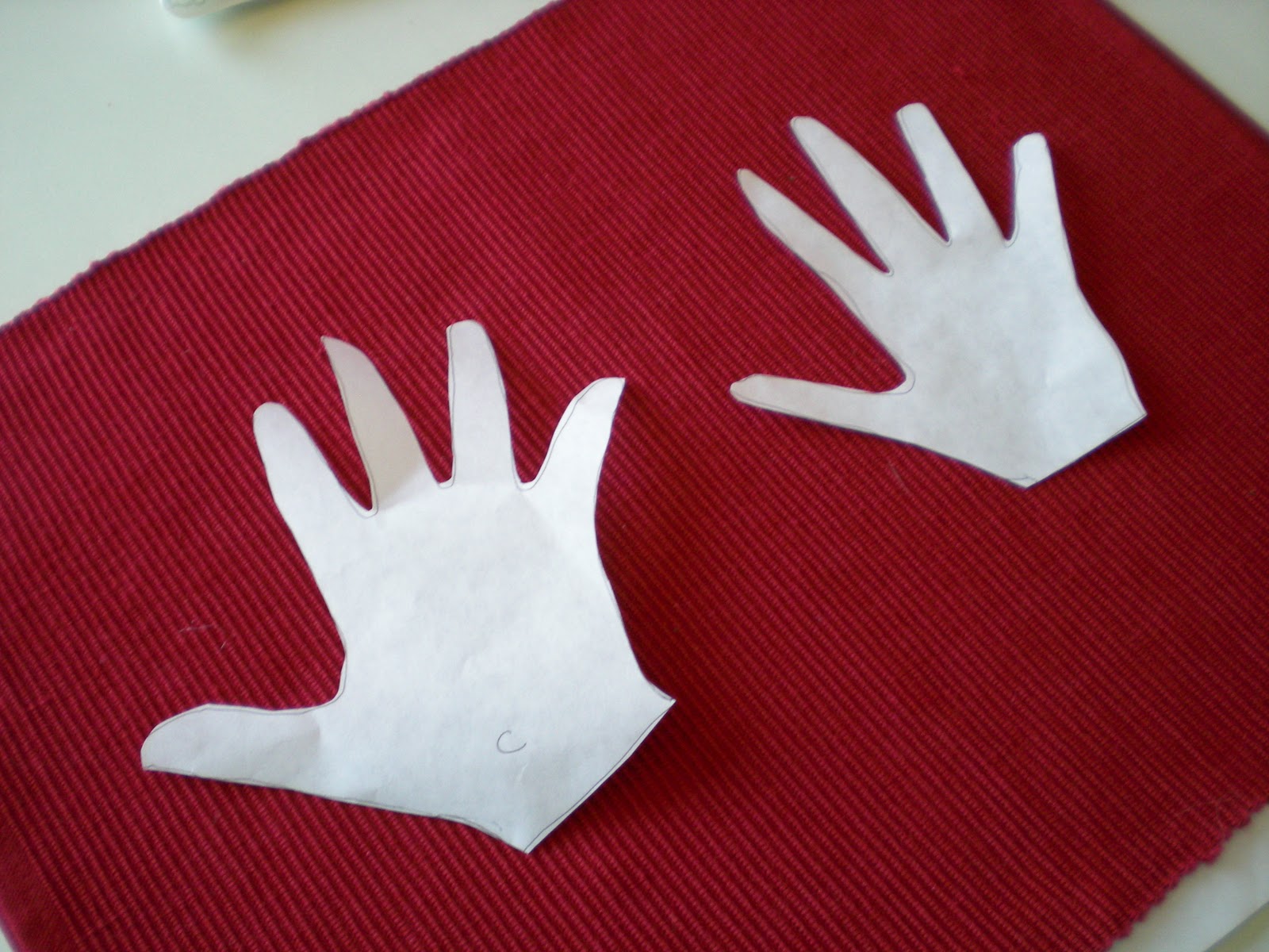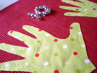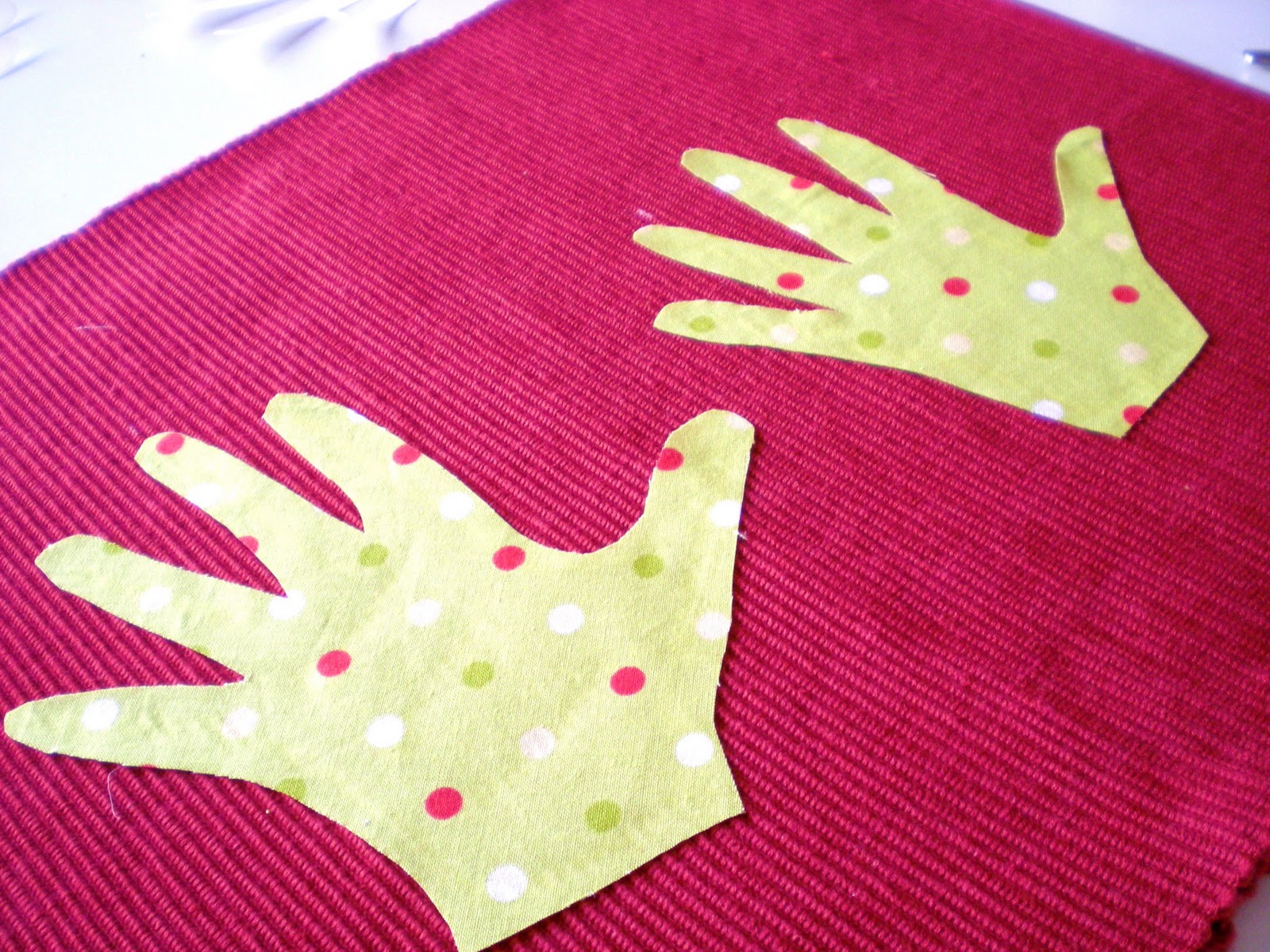 Iron the hands (shiny side to fabric) to the wrong side of your pretty Christmas fabric…