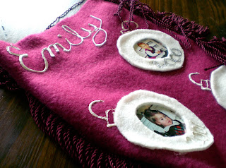 Again….I did this a long time ago–with 2 babies–it isn’t my best work–LOL. But it is homemade from my heart…and I love them. I made them out of fleece. I placed white fleece that was cut into a circle shape like an ornament (9 on the front, 9 on the back…) and every year we add a current picture to the stocking. I used puffy paint to write their name and the year on the ornament…