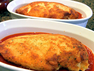 Heat about 1.5 cups canola oil in a saute pan. Heat to med/high. When oil is hot (you can test by dropping a tiny amount of bread crumbs in the oil….if it sizzles the oil is ready) Slowly place breaded chicken in the oil. You can cover loosely with foil to prevent splatter. Leave alone for 3 minutes…flip and cook another 3 minutes. They don’t need to be cooked through because you finished baking the chicken in the oven. They should just be golden brown. Take out of oil and place on top of tomato sauce. Bake in the oven for 20 minutes (or until chicken no longer pink)