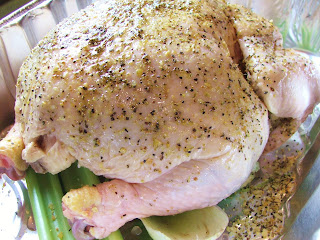 First you need a chicken….I just roasted one on some celery. Sprinkle with a bit of seasoning. Roast 425 for 1.5 hours. Carve the meat off.