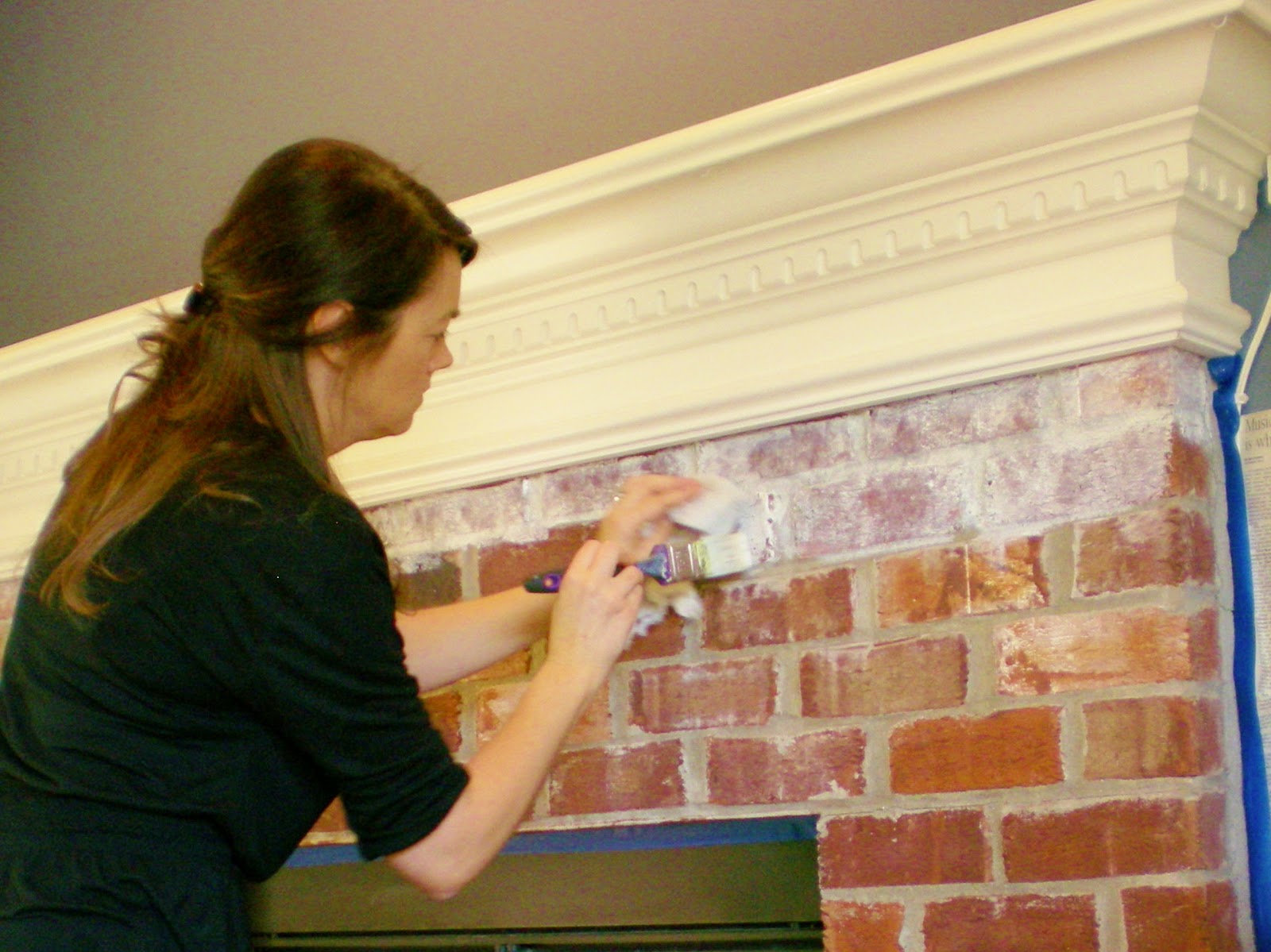 Sorry for the poor picture quality…wanted to show how to brush the paint on (be careful of splashes!) I brushed on 3 bricks and then pounces the rag to take some paint off. Also, before I started I taped off perimeters.