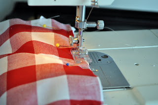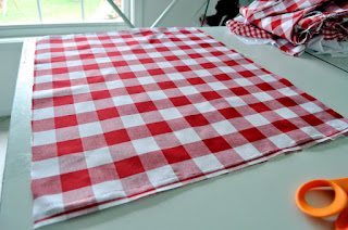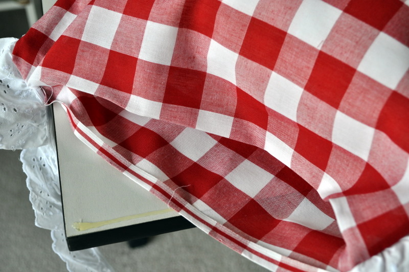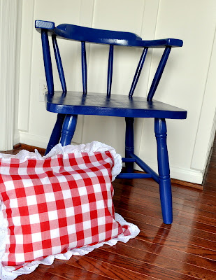 Red Gingham. What comes to your mind?? For me it is summer. It is such a happy and bright pattern. I used it to accent a chair that I recently refinished The Captains Chair. I thought the eyelet would be so cute next to the red and blue.