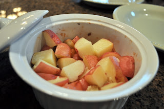 My fav recipe for roasted potatoes, is to cut them up like you did, then coat them with olive oil, salt and pepper well, chopped fresh rosemary, then spread on a baking sheet and roast at 425 for about 30-40 min…..