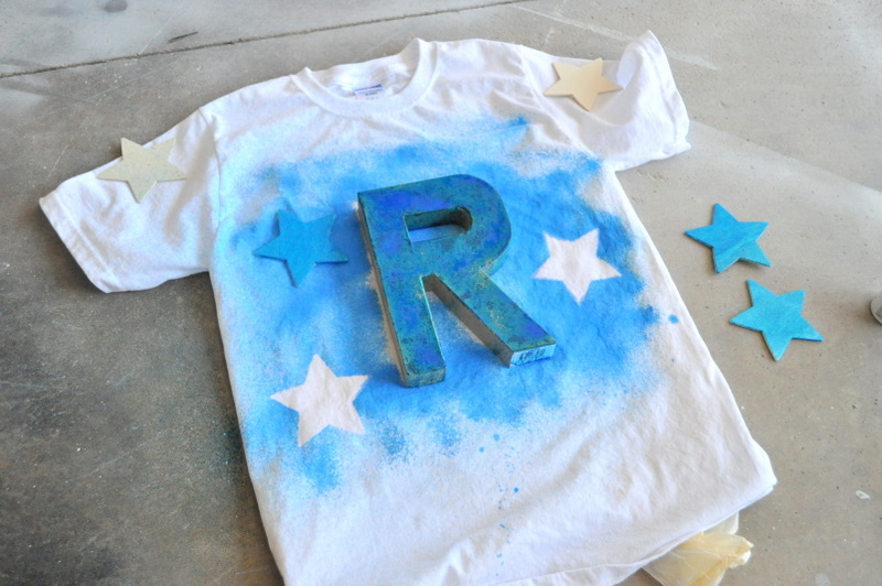 I used spray fabric paint and lightly coated the shirt so that when you removed the letter and stars…they would be white still.