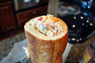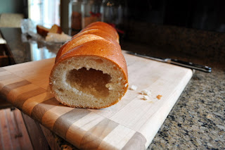 Slice off both ends of the baguette. Using a long thin knife and working from the both ends, hollow the baguette out leaving about ½-inch thick crust all around.