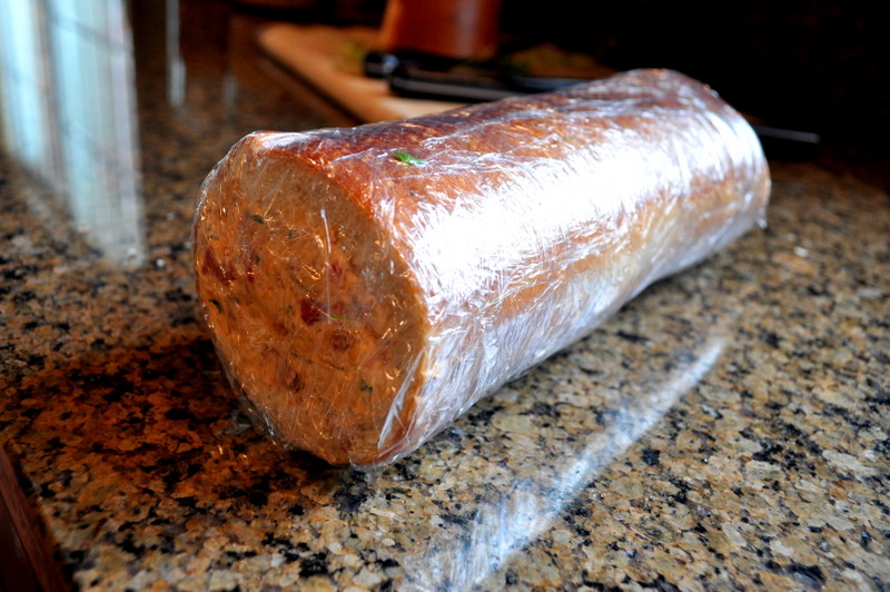 Working again from the both ends, fill the baguette with the cheese mixture. Pack the filling tight. I like to use a slender tequila shot glass for pressing the filling in. Wrap the stuffed baguette very well in plastic and refrigerate for at least two hours and up to two days. Right before serving, slice the baguette into ½-inch thick slices and serve. For the most neat looking slices, treat it as a cheesecake – each time slice it with a hot dry knife.