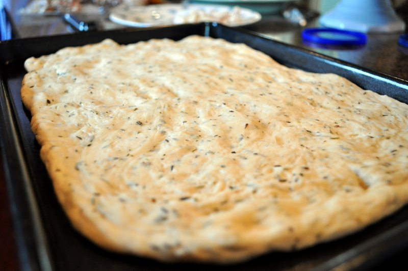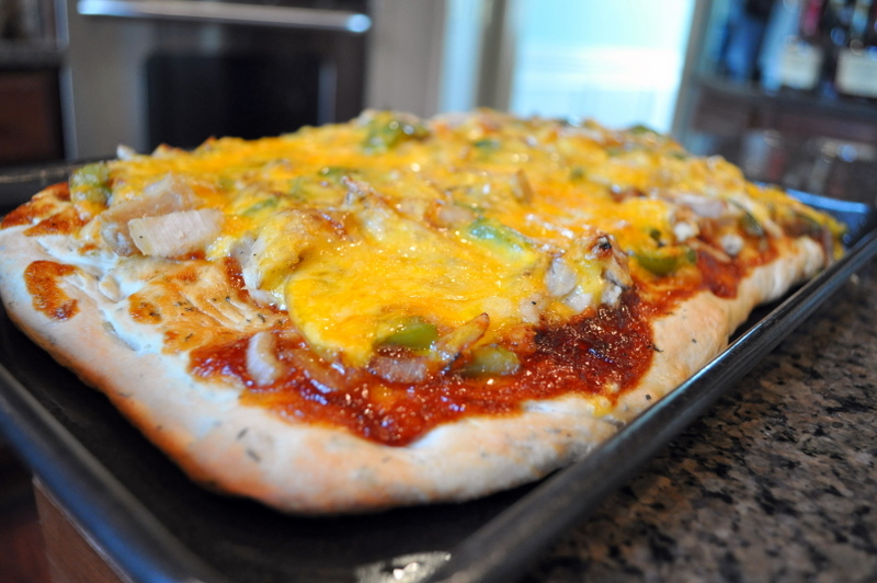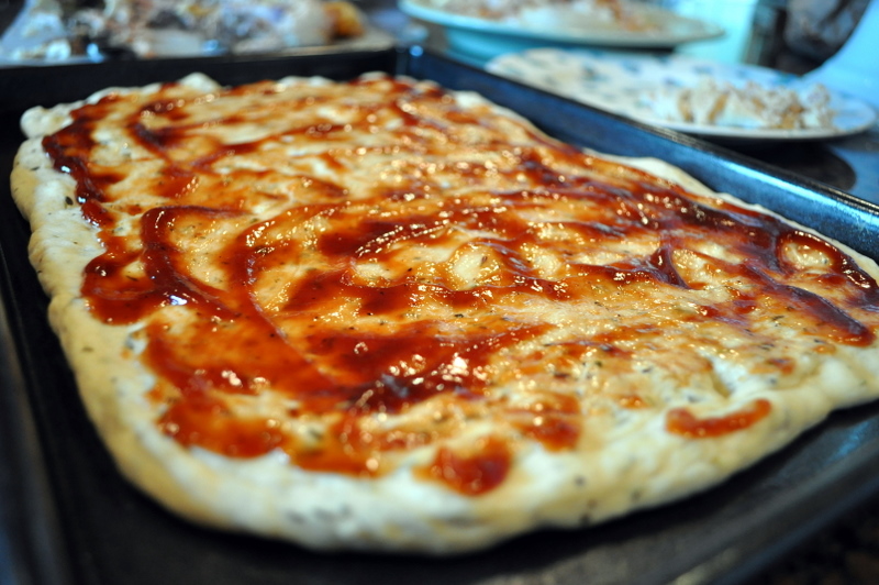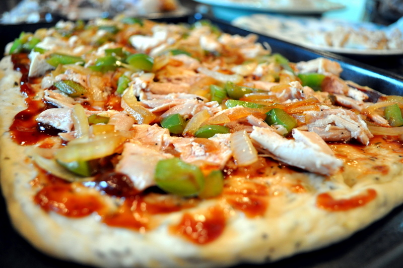 We made some homemade foccacia bread and topped it with some yumminess…..Barbecue chicken pizza is a great way to use up some already cooked chicken…along with any other veggies you have on hand.