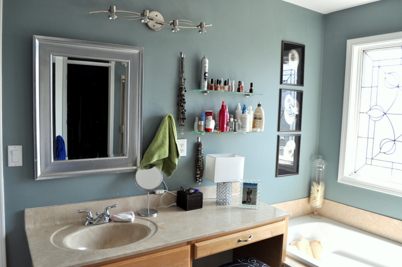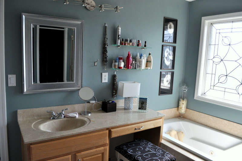 This project is something I have wanted to do for a very long time. We have a really nice space for our Master bathroom and closet. When we built the house about 7 years ago we choose a slate blue tile for the floor. I still love it. It would love some gorgeous traverine tiles also….gorgeous!! I painted the bathroom and added a bit of storage about a year ago. It was one of the last rooms I “decorated”…..seems to be a forgotten room sometimes.