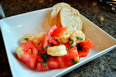 3.In a second large bowl, toss the shrimp, baguette, tomatoes, and basil with the lemon juice, the remaining 2 tablespoons of oil, ½ teaspoon salt, and ¼ teaspoon pepper.