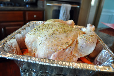 Place the chicken on the veggies and pat it dry. (be sure to take out the giblet and neck sac inside the chicken) You can use that to make stock so I just place it in the fridge in case I want to make stock later.