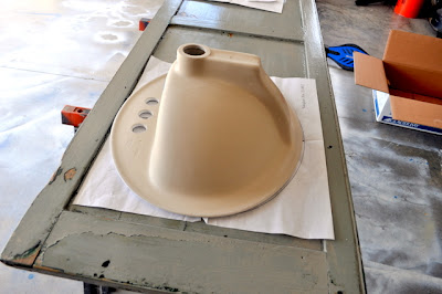 Your sink will come with a paper template. Place that on the shutter (or wood) and be sure it will fit nicely in the center. You also want to measure where your drain pipe comes out from the wall. Mine came out 8.5 inches from the wall….so I was sure to line up the drain so that it was close to 8.5 inches from the back of the counter.