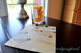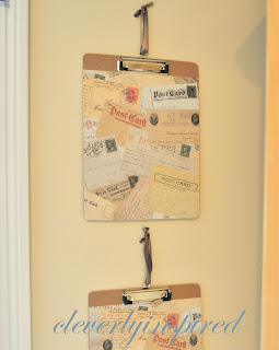 A couple of dollar store clipboards get all nice and pretty with some paper and rubber cement. I hung them on the wall to allow the kids to have a place to put them back and remind them to use them if they need too.
