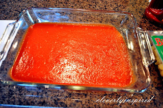 First..place the frozen spinach in the microwave to thaw it. While that is thawing–get out a 9 by 13 pan…pour some sauce in it. I normally use classico…but I had this on hand.