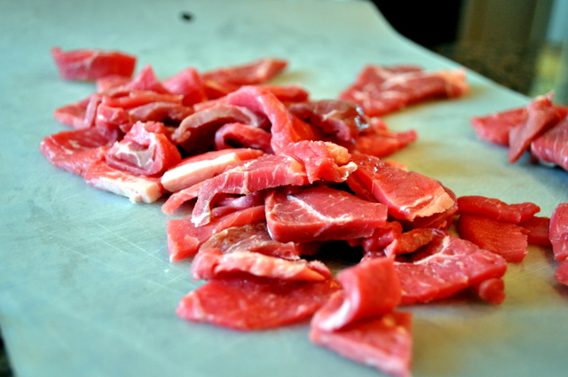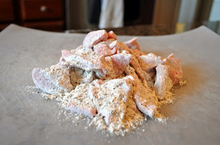 Cut the beef up prior to flouring.