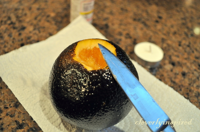 Let the paint dry over night. Then use a paring knife to cut a circular space out of the top of the fruit (making sure you use the end that doesn’t balance as well)