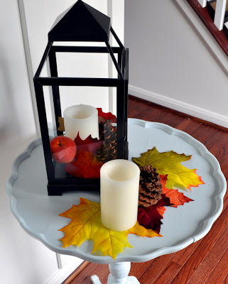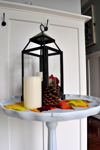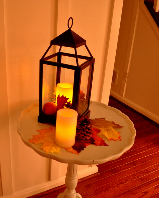 Sometimes….you can just pull stuff from around your house…and you place it in a different spot…and it makes all the difference to the feel of the room. I had this lantern. It was in the family room. I decided to use it in the foyer on this little table I redid.