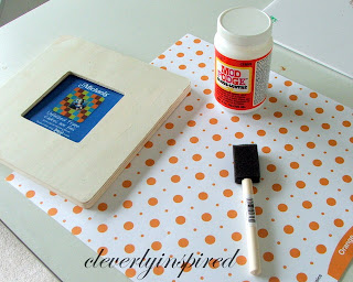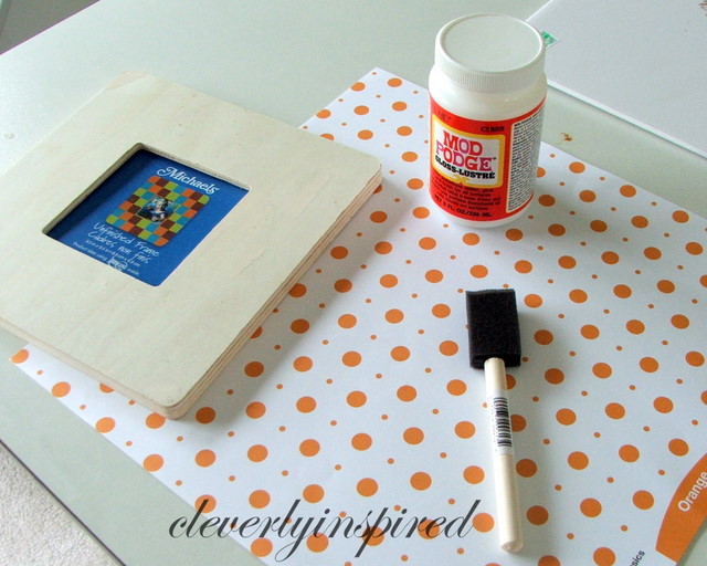 You need a wooden frame (Michael’s for $1!) mod podge, sponge brush, and a couple favorite scrapbooking cardstocks.