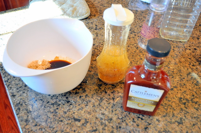Place 4 frozen chicken breast in the crock pot. Combine sauce, dressing, Worcestershire, and brown sugar. Pour over chicken.