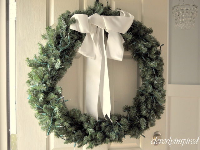 We have used this large wreath on the front door for a few years. It has a couple strands of white lights and a super wide satin white bow.