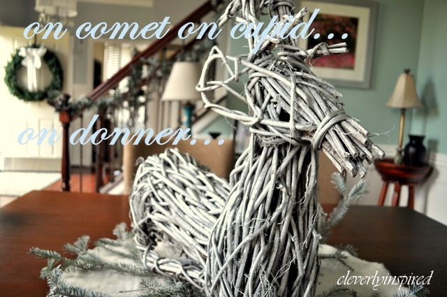 The Dining room table gets a twig reindeer that I have had several years. I sprayed it white and silver this year and placed it on some fluffy material and evergreen.