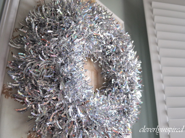 A couple of glass vases I had in the closet get filled with silver pine cones (huge bag at Homegoods for $5, I swear I used them everywhere!)