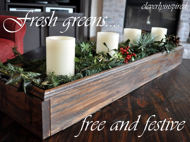 Fresh evergreen from the Christmas tree cuttings and holly from outside fill the “boat” (we call it) Free and very festive. The candles are electric :)