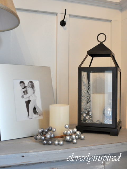 The lantern gets a taste of the season with some silver sparkly ornaments and some left over Christmas picks from last year.