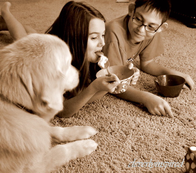 “And LOOK, Putter agrees with me. Good Putter, take some of Emily’s stolen ice cream. Good boy.”