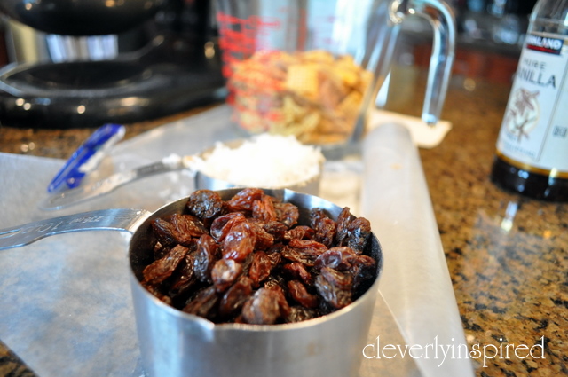 Mix in the vanilla and egg. Combine. Then toss in dry ingredients. Ending with raisins, chex and coconut.