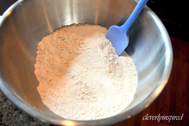 • Mix together in a large bowl flour, sugar, baking powder, salt; and set