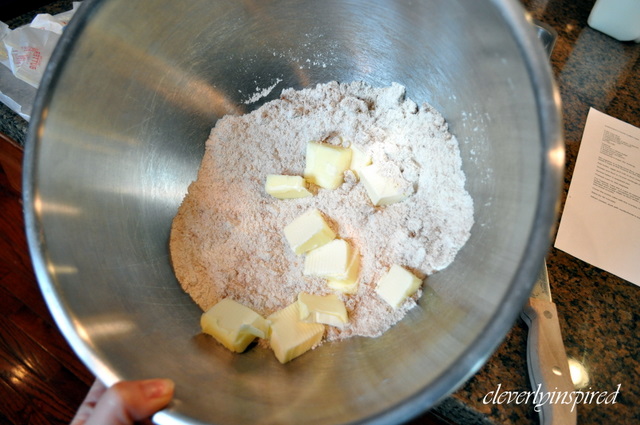 Take the 2 cups of reserved flour mixture and add to the butter, brown sugar, cinnamon and salt. Mix together with your pastry cutter until blended and lumps begin to form when you squeeze the mixture making small pea-sized crumbs.