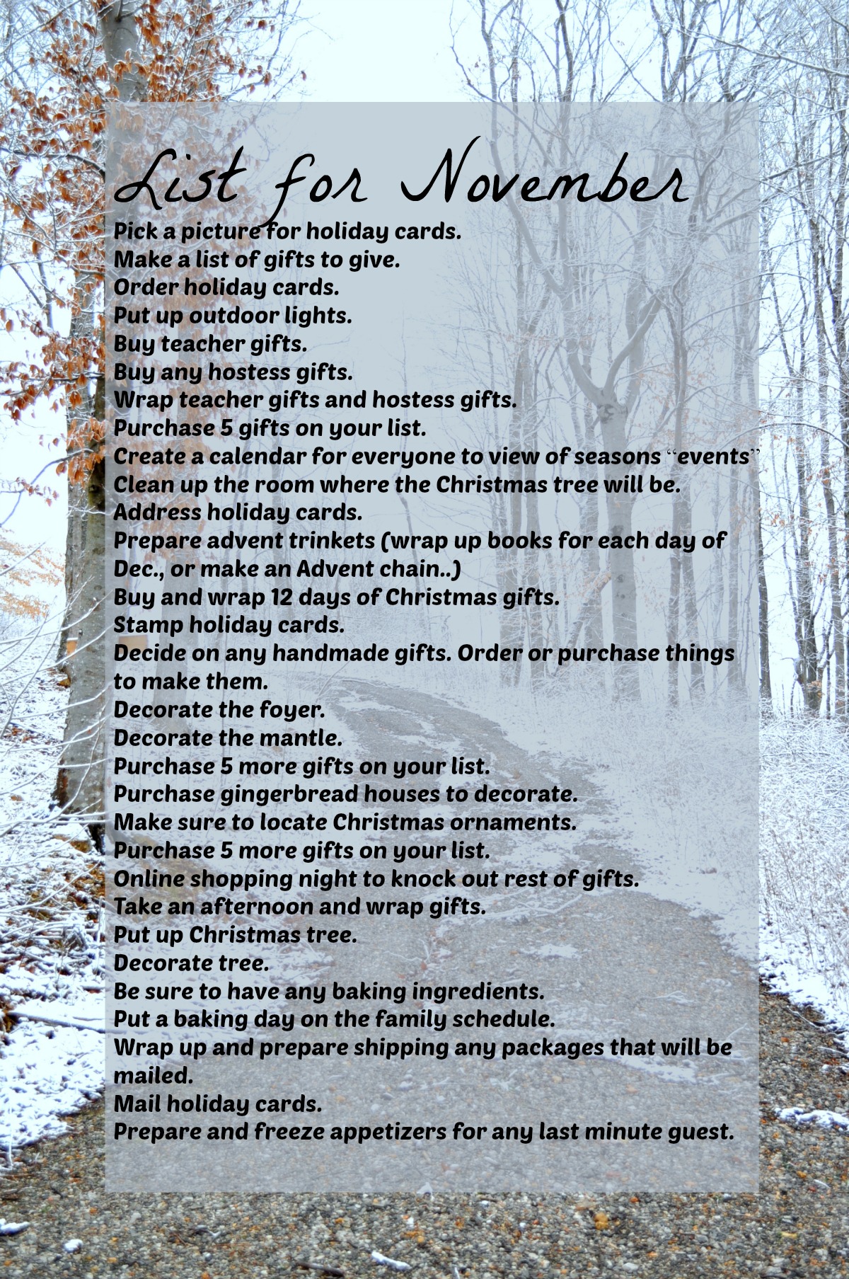 Eat an elephant. That is what it feels like we have to do every December. Rush to get it all done. That is never fun for anyone….people get grouchy…grouchy is not fun. Here is a list I compiled of for the month of November. Feel free to swap out things that will make it more helpful to you. There are 30 days in November….just think…if you crossed one thing off the list everyday…you may just be able to really enjoy the best parts of the holiday….without rushing through it all.