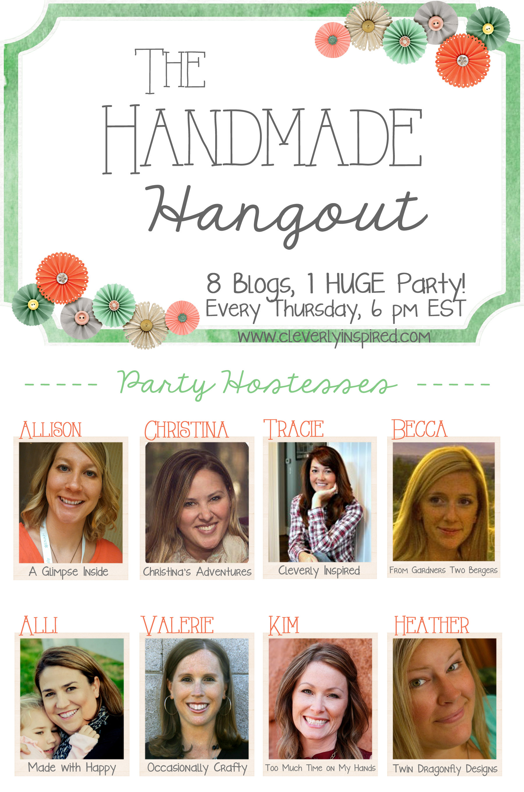 Also….some fun news!! I will be co-hosting the Handmade Hangout each and every Thursday with these lovely ladies….Every week bloggers can link up their most amazing current projects…and every week I will be picking a few to feature. It is a great way to find new inspiration…and if you a new blogger it is a great way to get yourself out there and be seen!! Link up every Thursday evening at 6:00pm EST. Check out my fellow co-host below….they are all seasoned bloggers who share awesomeness daily:)