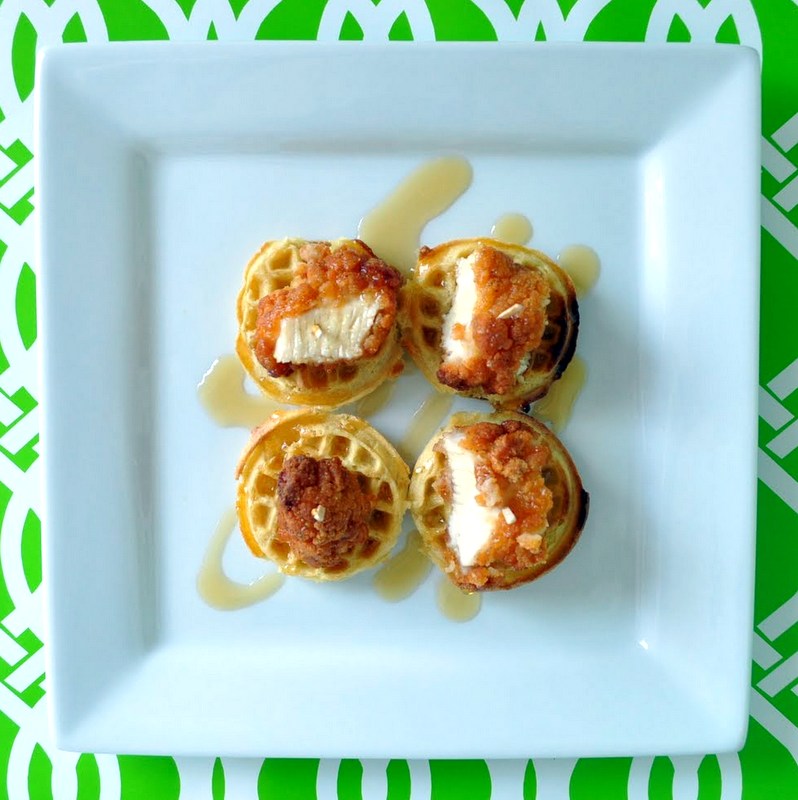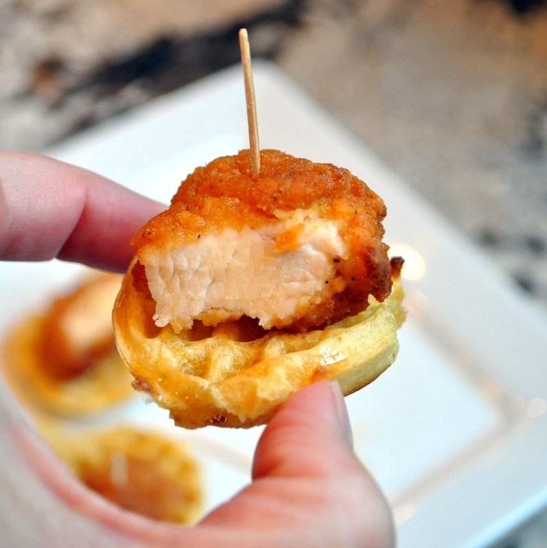 All you’re going to need is some frozen mini waffles, real chicken tenders and a good quality maple syrup (makes it extra special:) While your chicken tenders are cooking in the oven you can toast up your mini waffles and heat a little bit of syrup. Just use a toothpick to secure….seriously easy and seriously yum:)
